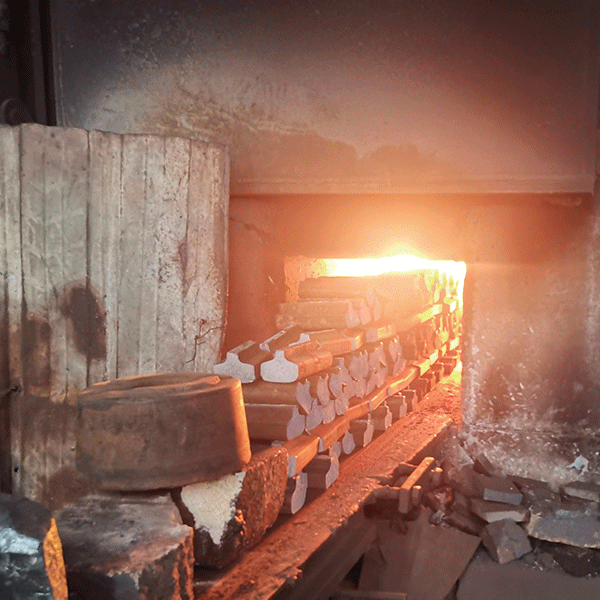 The steel blocks are heated in a high-temperature furnace until they reach forging temperature, preparing the metal for shaping and refining its internal structure.