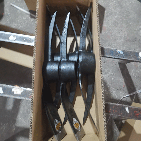 Handles are fitted and secured, followed by weight and balance testing. The finished pickaxes are packed in export cartons or bundled for shipment.